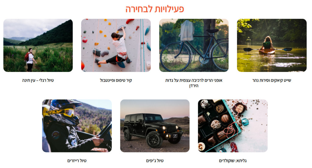 לדוגמא, ניתן להשתמש ברשימת הדוברים כדי להציג פעילויות לבחירה בנופש החברה שלכם. במקרה שכזה שם הדובר הופך לשם הפעילות, תמונת הדובר לתמונת הפעילות, ובמקום קורות חיים אפשר לכתוב בדיוק עבור מי מיועדת הפעילות. ממש כמו שעשינו כאן:
