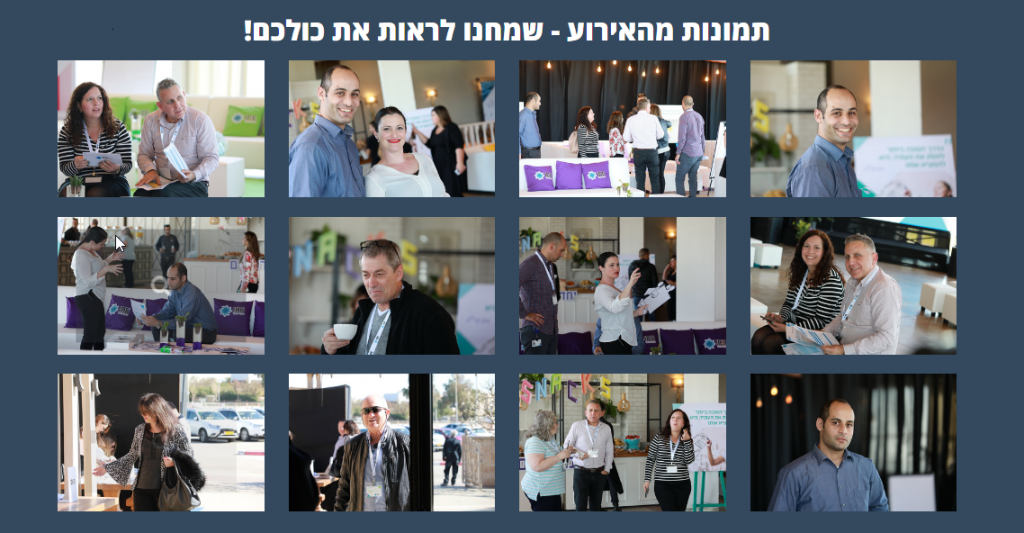 כלומר, אנו ממליצים לכם להשתמש בתשתית שהכנו עבור העלאת האוספים בהתאם לתכנים הייחודיים שיש לכם לחלוק עם באי הכנס, האירוע או הנופש שלכם.